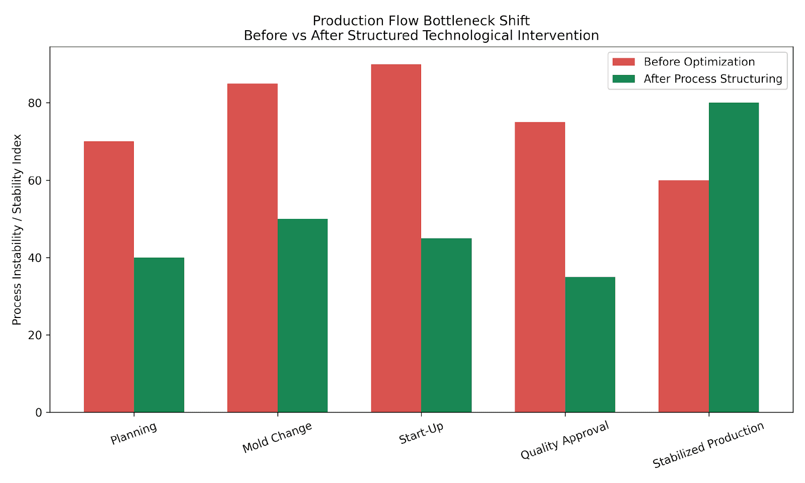 Srednja kompanija za injekciono brizganje sa 5–15 mašina. Analiziran kompletan tok – od ulaza sirovine do gotovog proizvoda.